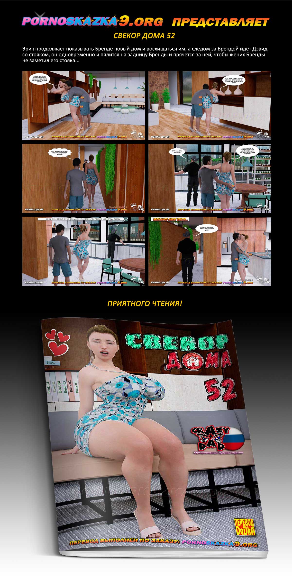 Порно комикс «Свёкор дома. Часть 52». Эрик продолжает показывать Бренде новый дом и восхищаться им, а следом за Брендой идет Дэвид со стояком, он одновременно и пялится на задницу Бренды и прячется за ней, чтобы жених Бренды не заметил его стояка…